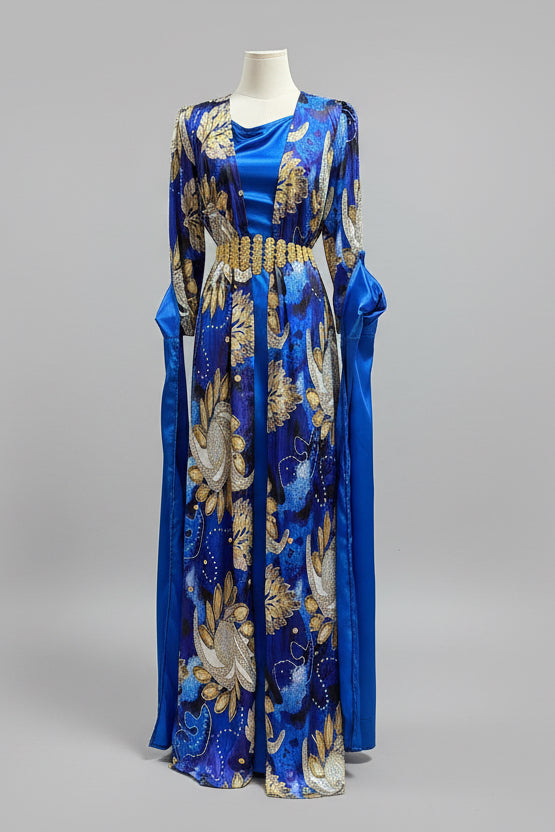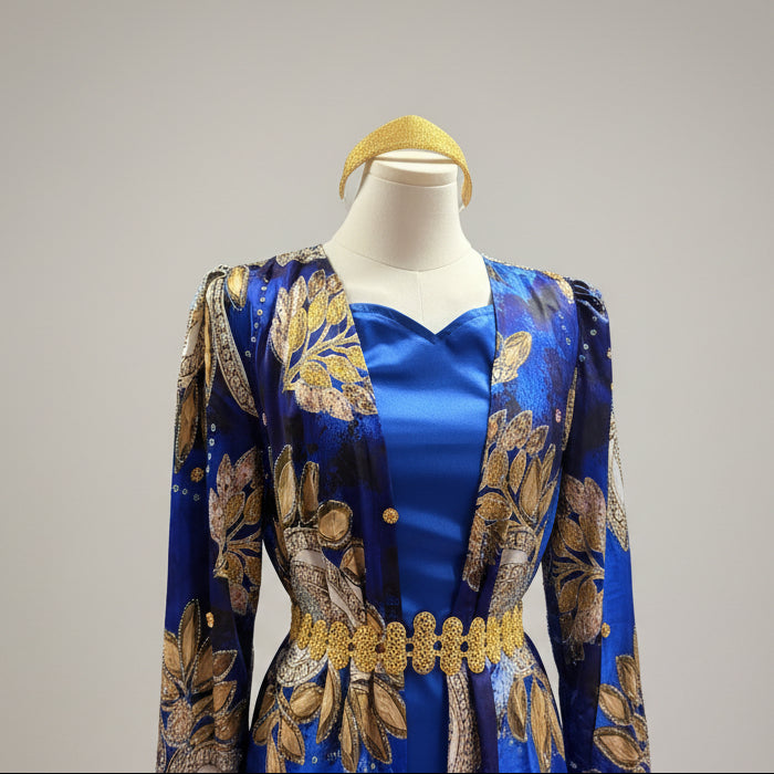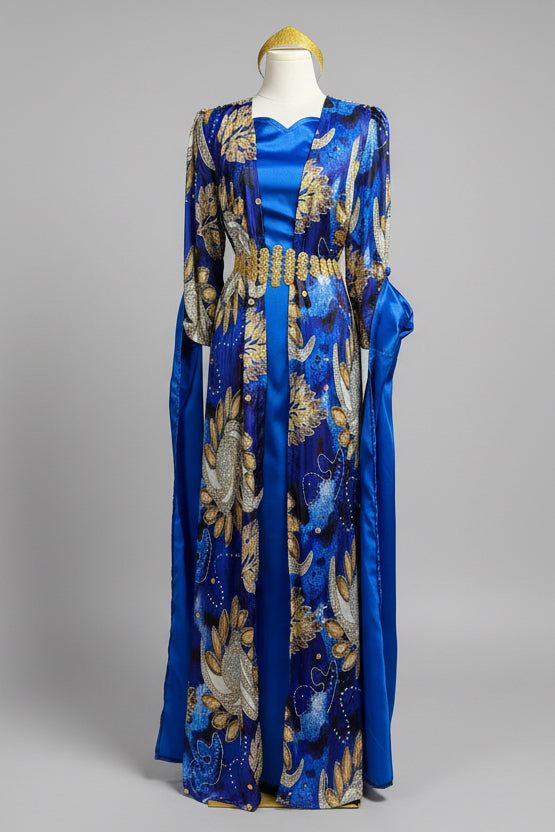 Laissez-vous envoûter par la robe traditionnelle Berfin, une création majestueuse aux teintes bleu profond et aux reflets dorés. Son tissu fluide est sublimé par un voile richement orné de motifs raffinés et de broderies lumineuses, évoquant la noblesse et la délicatesse des traditions ancestrales.