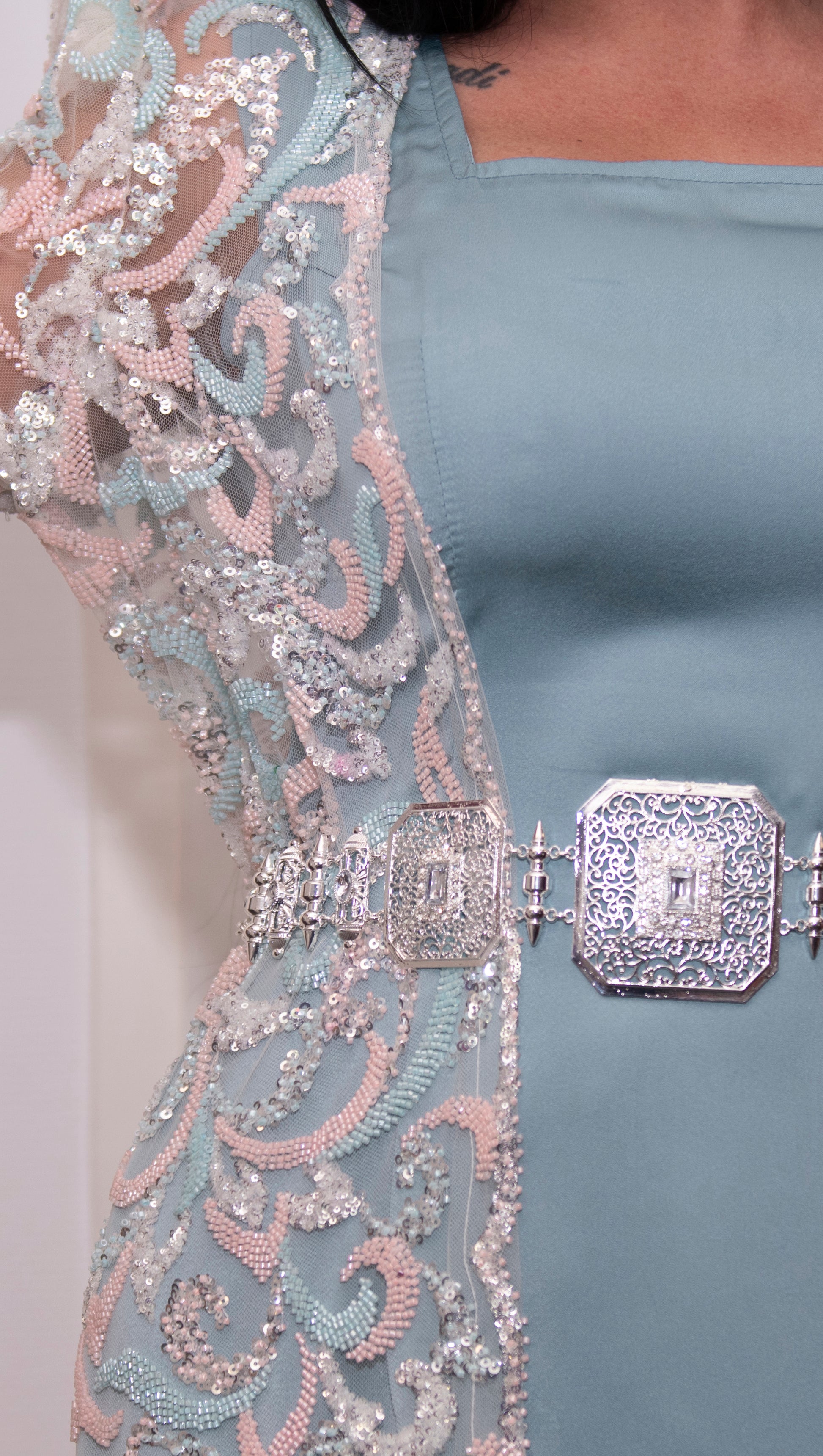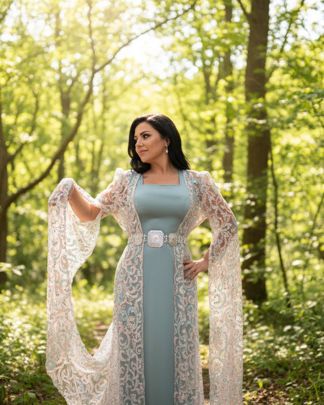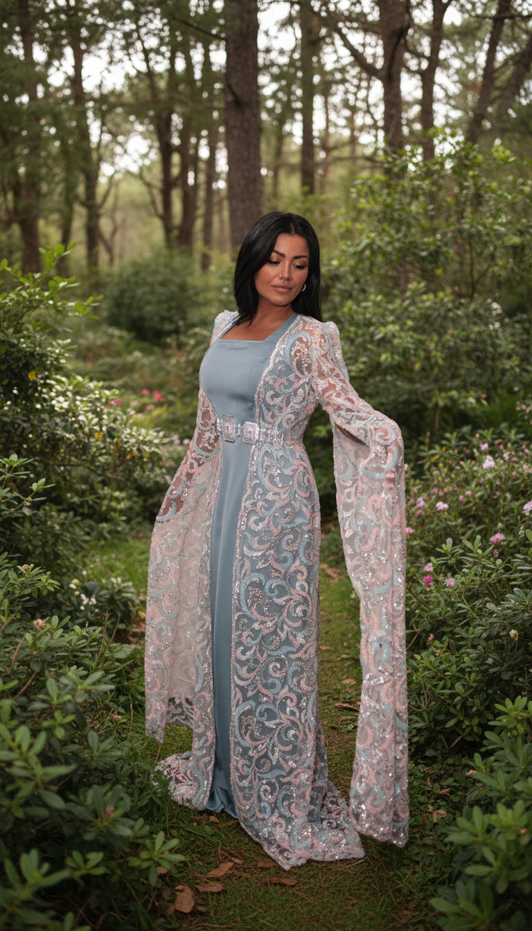 Son satin bleu pastel et son voile brodé de sequins créent une silhouette délicate et raffinée.