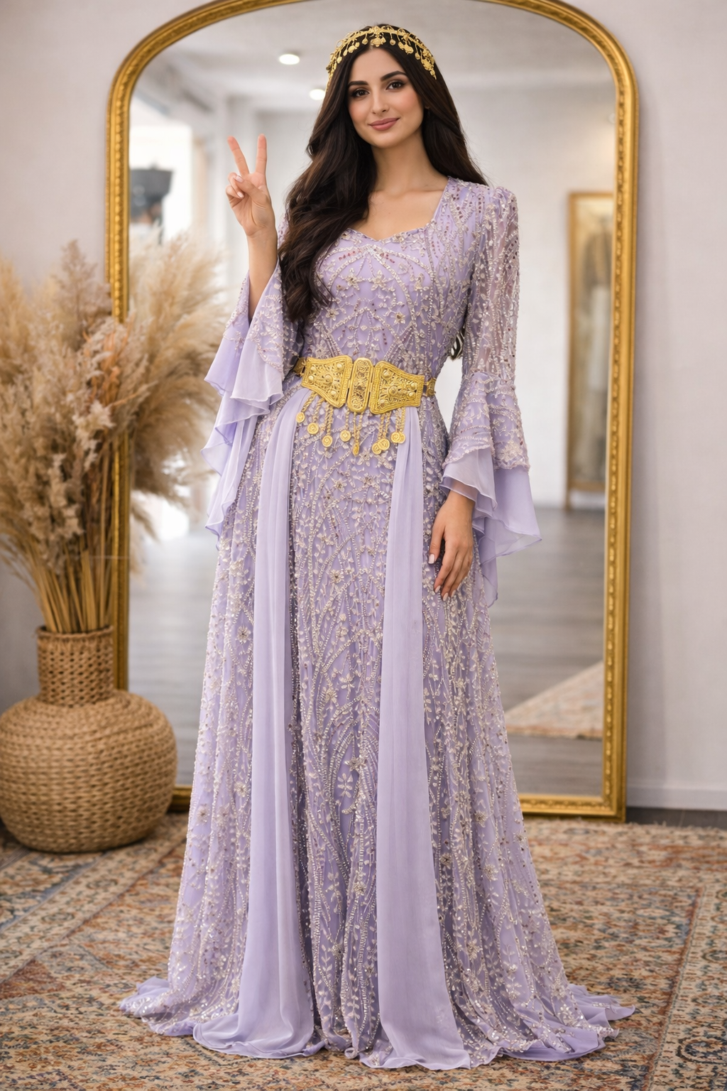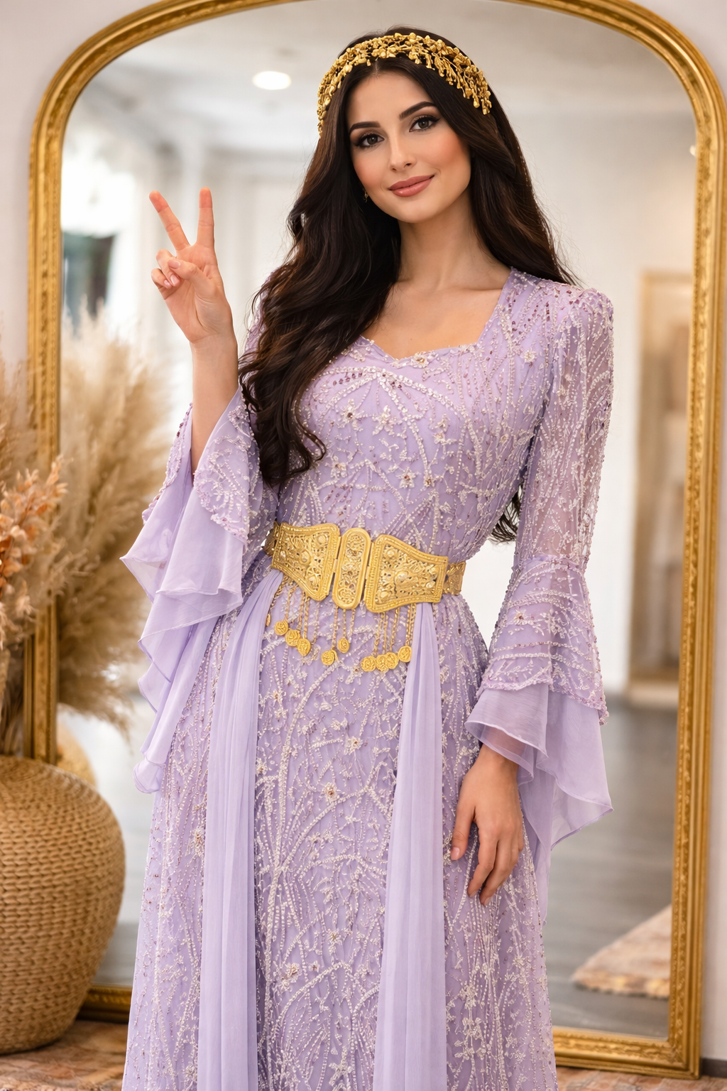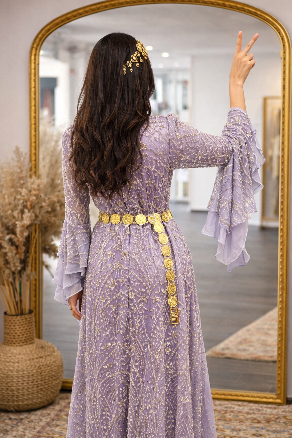 Découvrez la robe traditionnelle Rojbîn, une création élégante inspirée par la délicatesse des fleurs. Son tissu fluide est sublimé par un voile finement brodé et scintillant, apportant profondeur, finesse et mouvement à chaque pas. Les manches aériennes viennent sublimer cette silhouette gracieuse et harmonieuse.