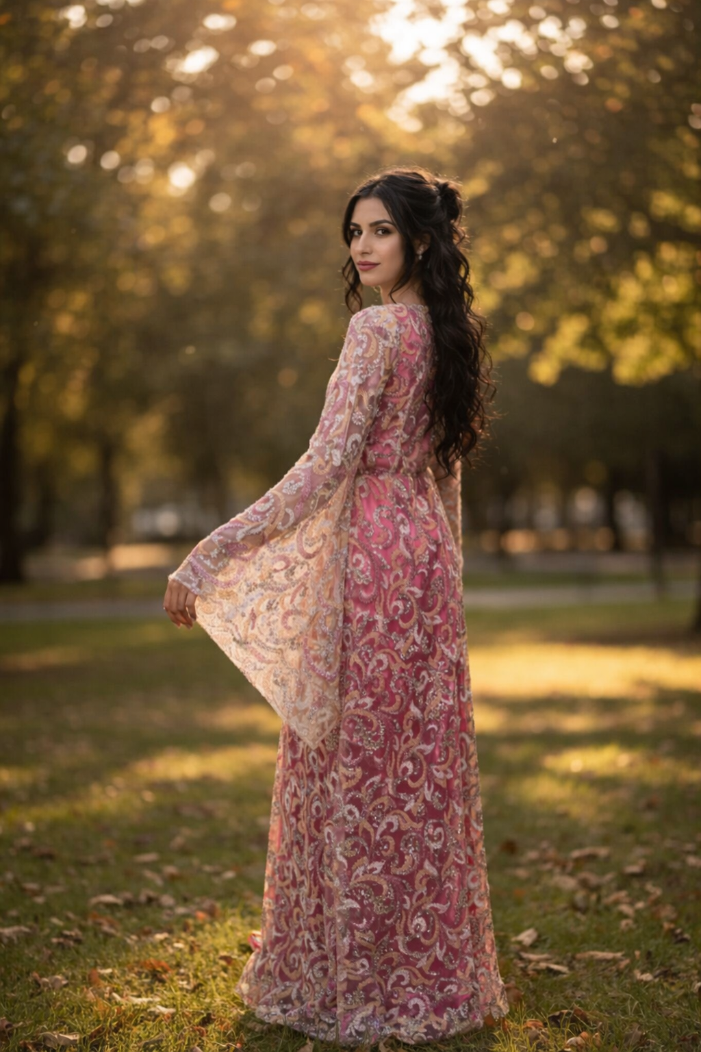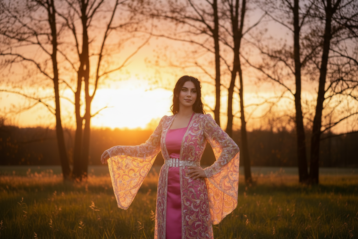 La robe Ziryan séduit par son éclat unique et son raffinement. Confectionnée dans un satin rose intense et sublimée par un voile brodé aux motifs scintillants, elle allie tradition et modernité.